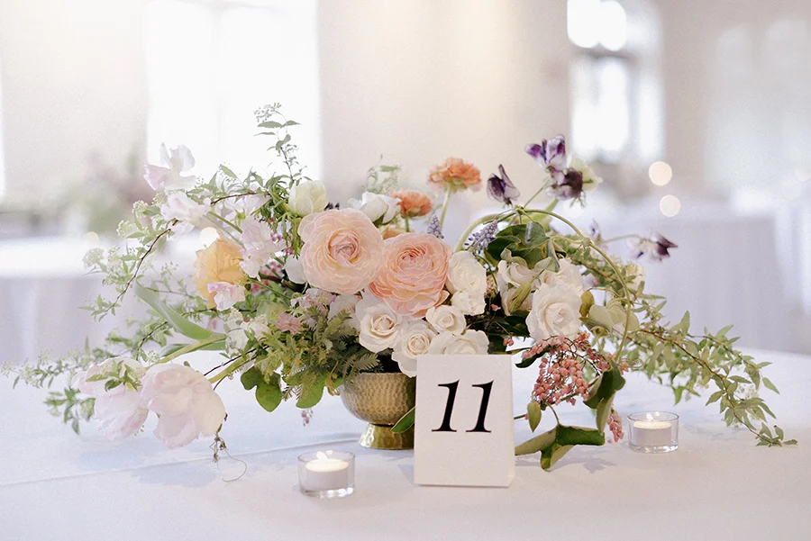 A sleek, colorful wedding with giant ranunculus and a head table garland with acacia, foxglove, carnations, tulips, sweet peas, ranunculus, anemeones, viburnum berries, spirea and other spring flowers!